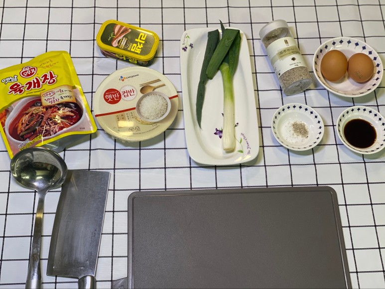 리챔 120g 대파 1개 식용유 2큰술 진간장 1큰술 달걀 2개(60g) 후추소금 1g 미원약간